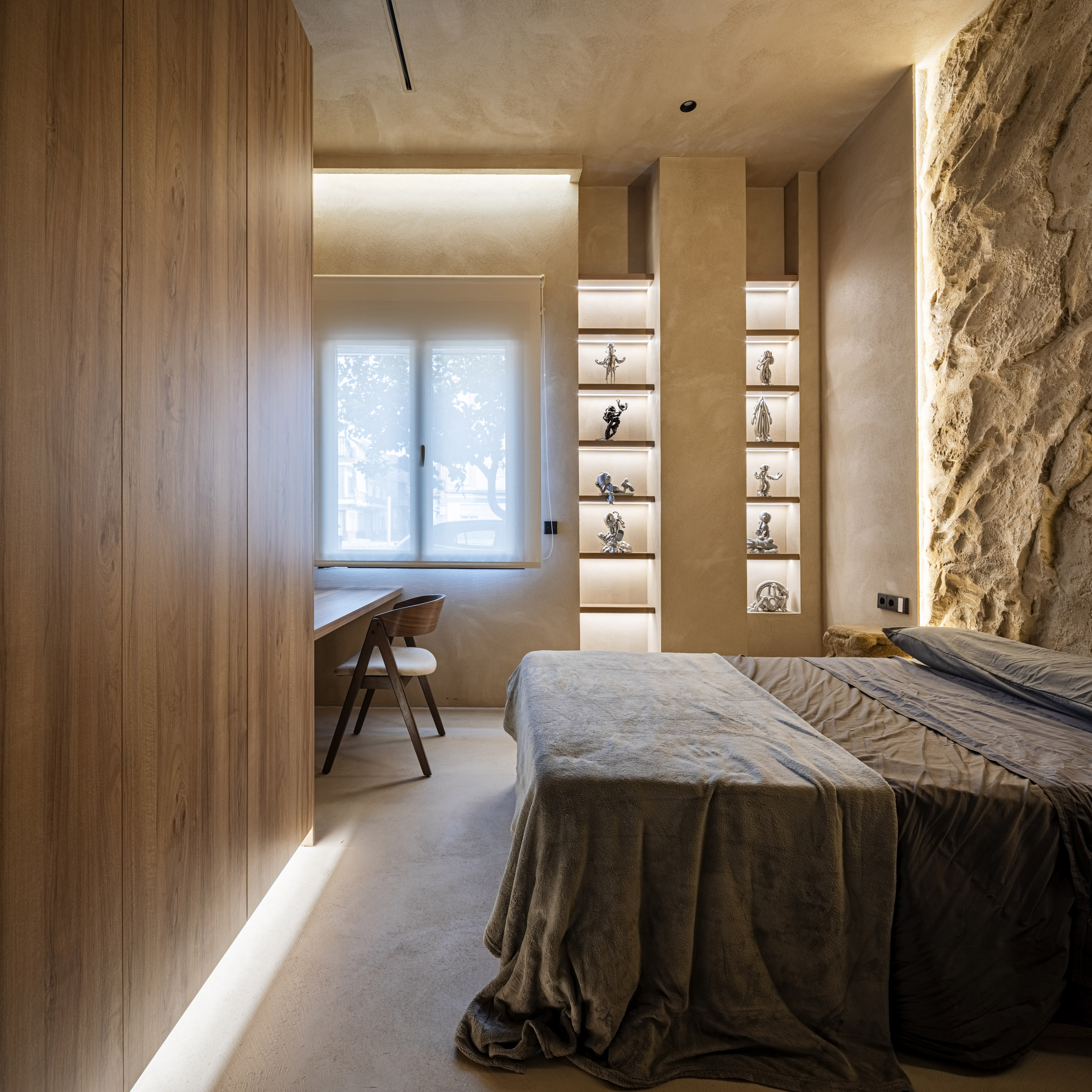 El objetivo del proyecto era crear un espacio residencial que reflejara su estilo de vida cosmopolita, interpretado a través de la filosofía wabi-sabi: una visión estética que celebra la belleza de lo natural, lo simple y lo atemporal.