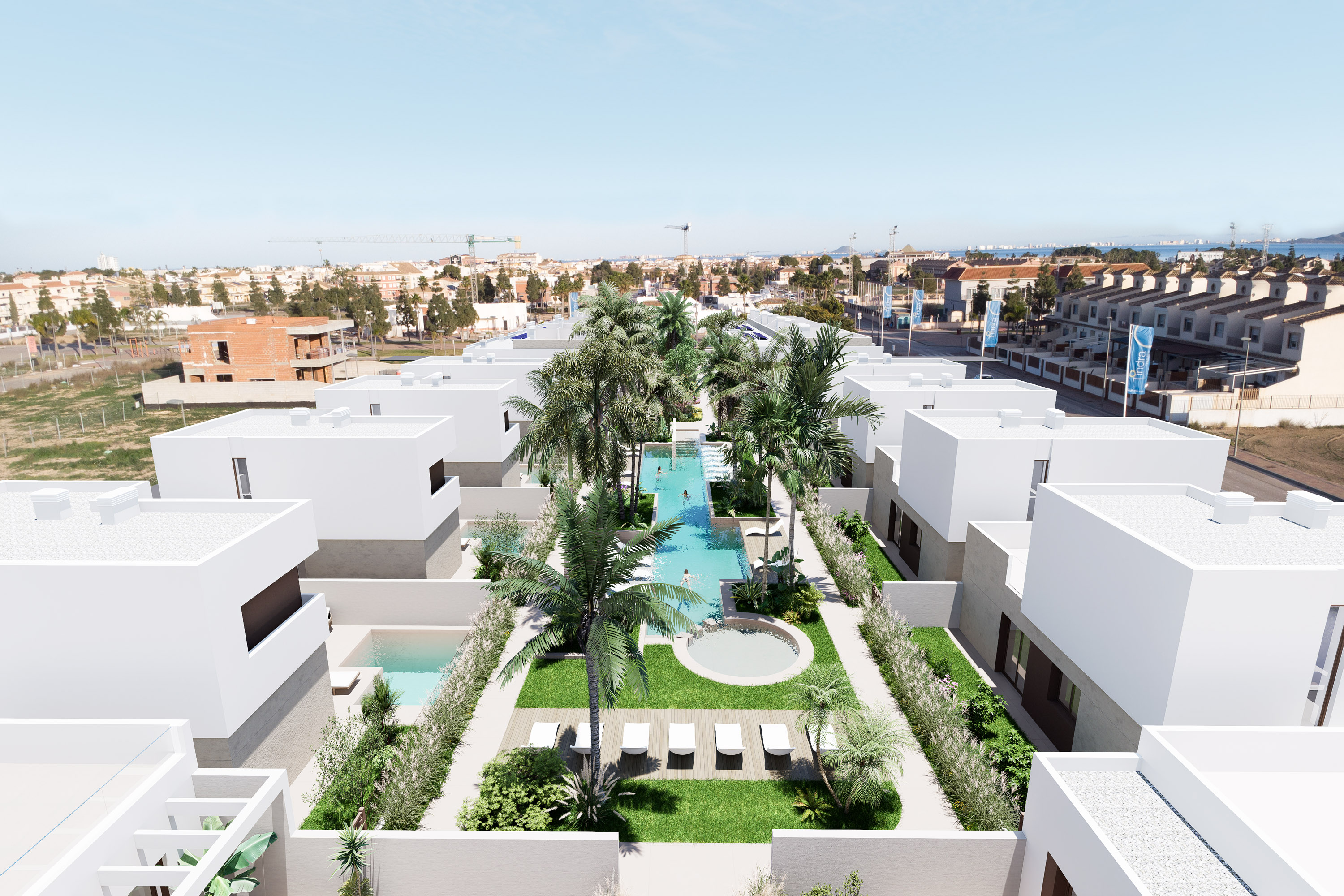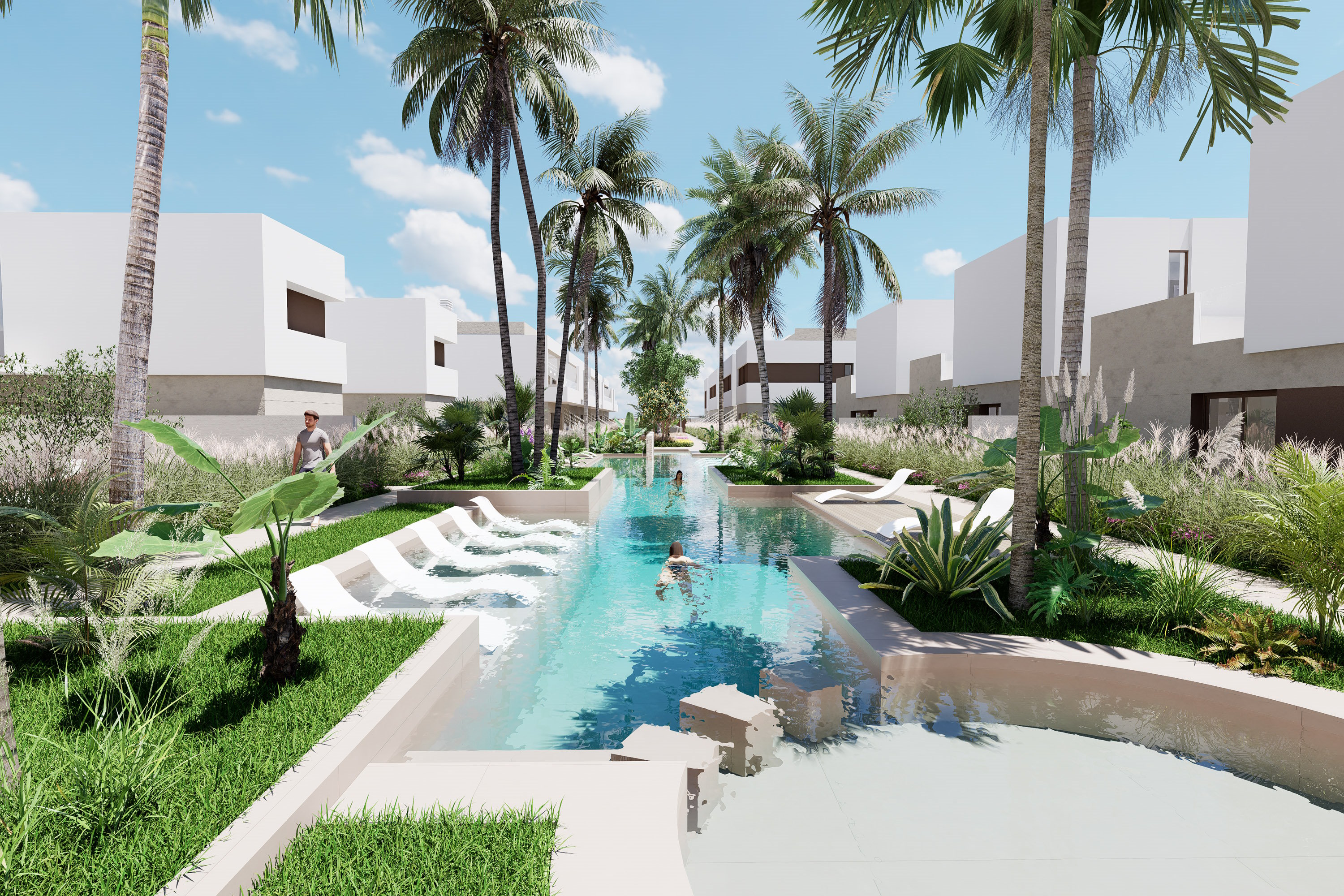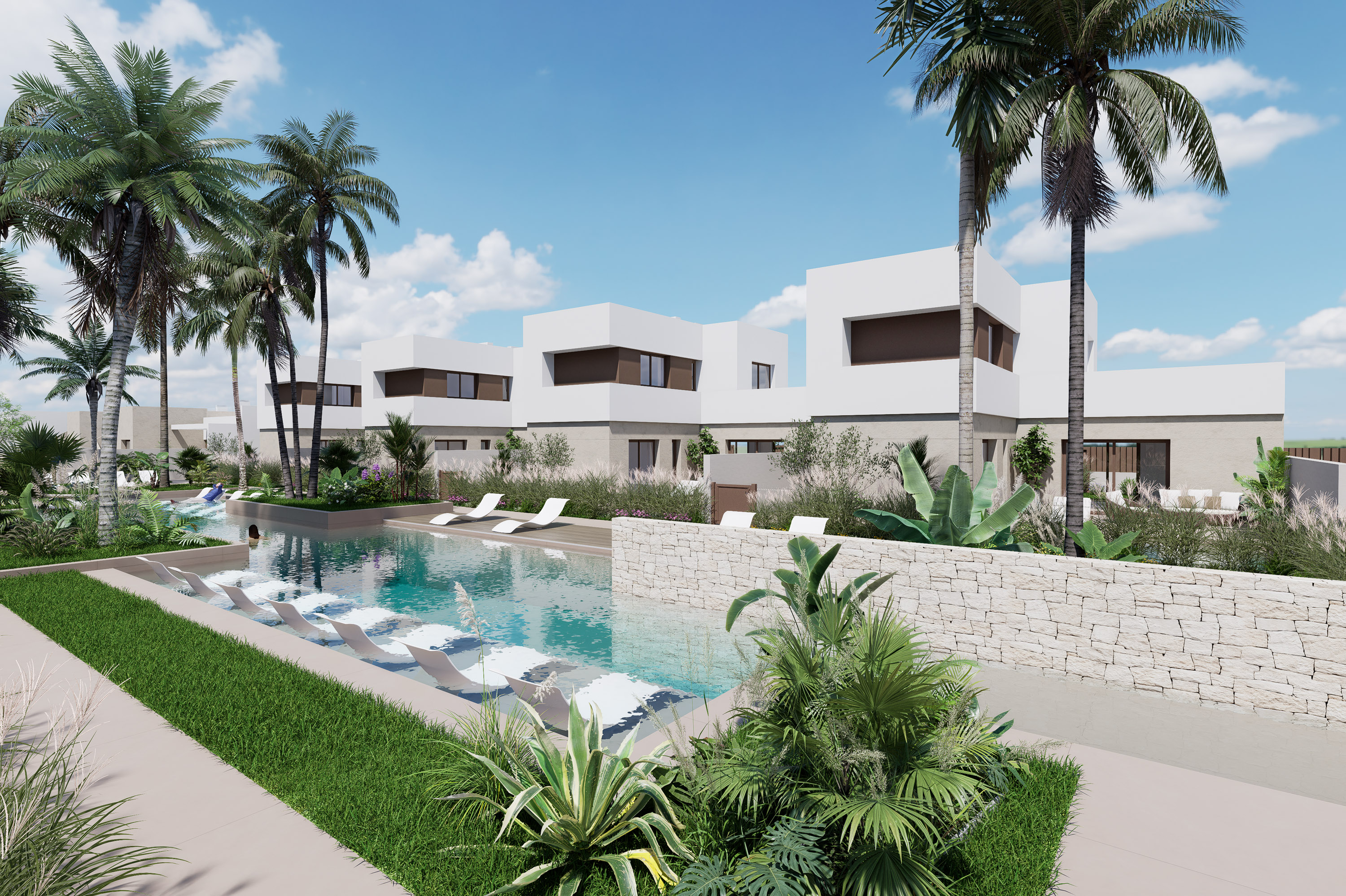 El proyecto se articula en torno a una cuidada zona comunitaria con piscina, solárium y jardines mediterráneos, diseñados para invitar al relax y al bienestar. Las viviendas, de arquitectura contemporánea, apuestan por líneas puras, volúmenes rotundos y una integración armoniosa con el entorno natural.