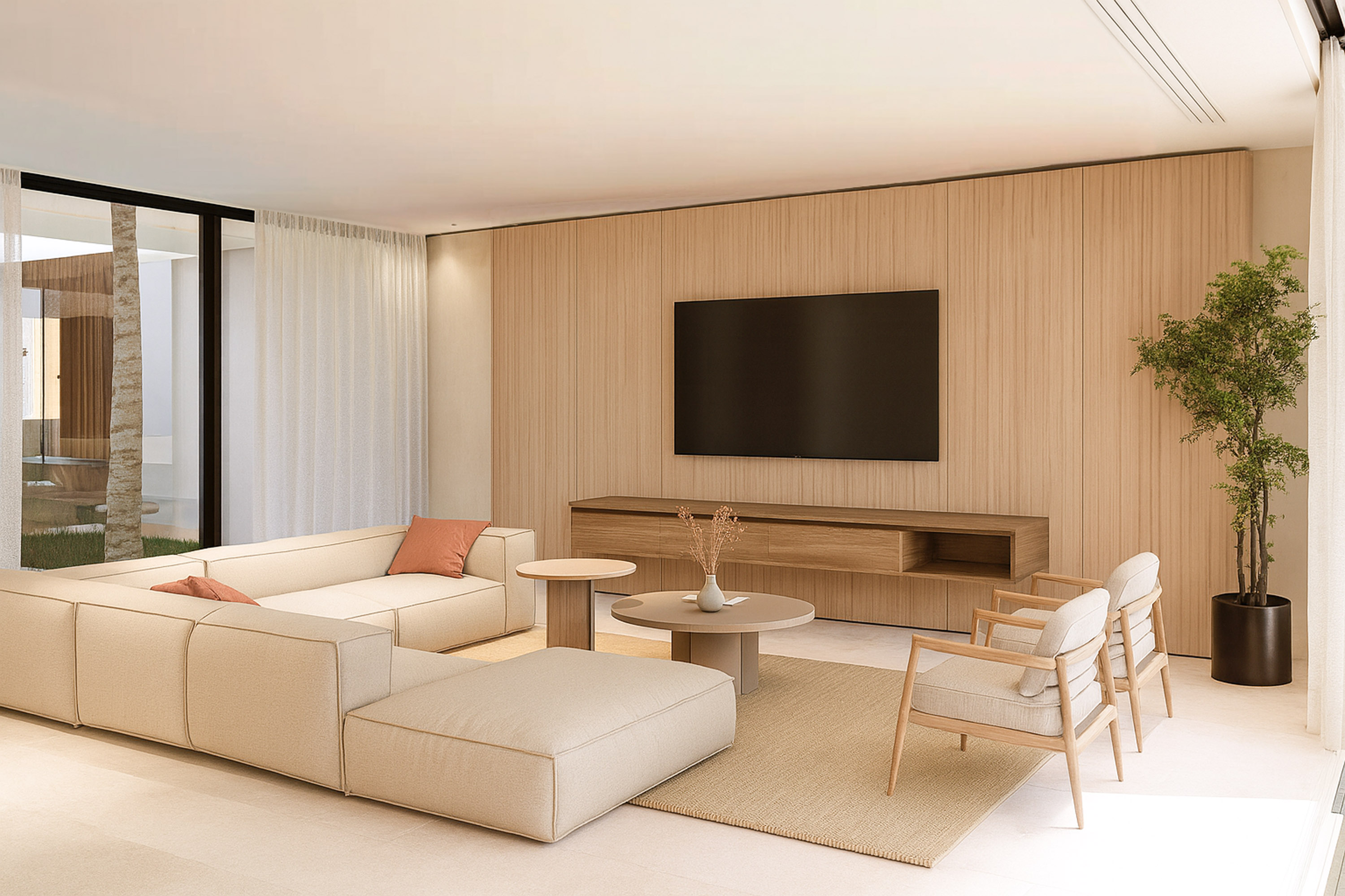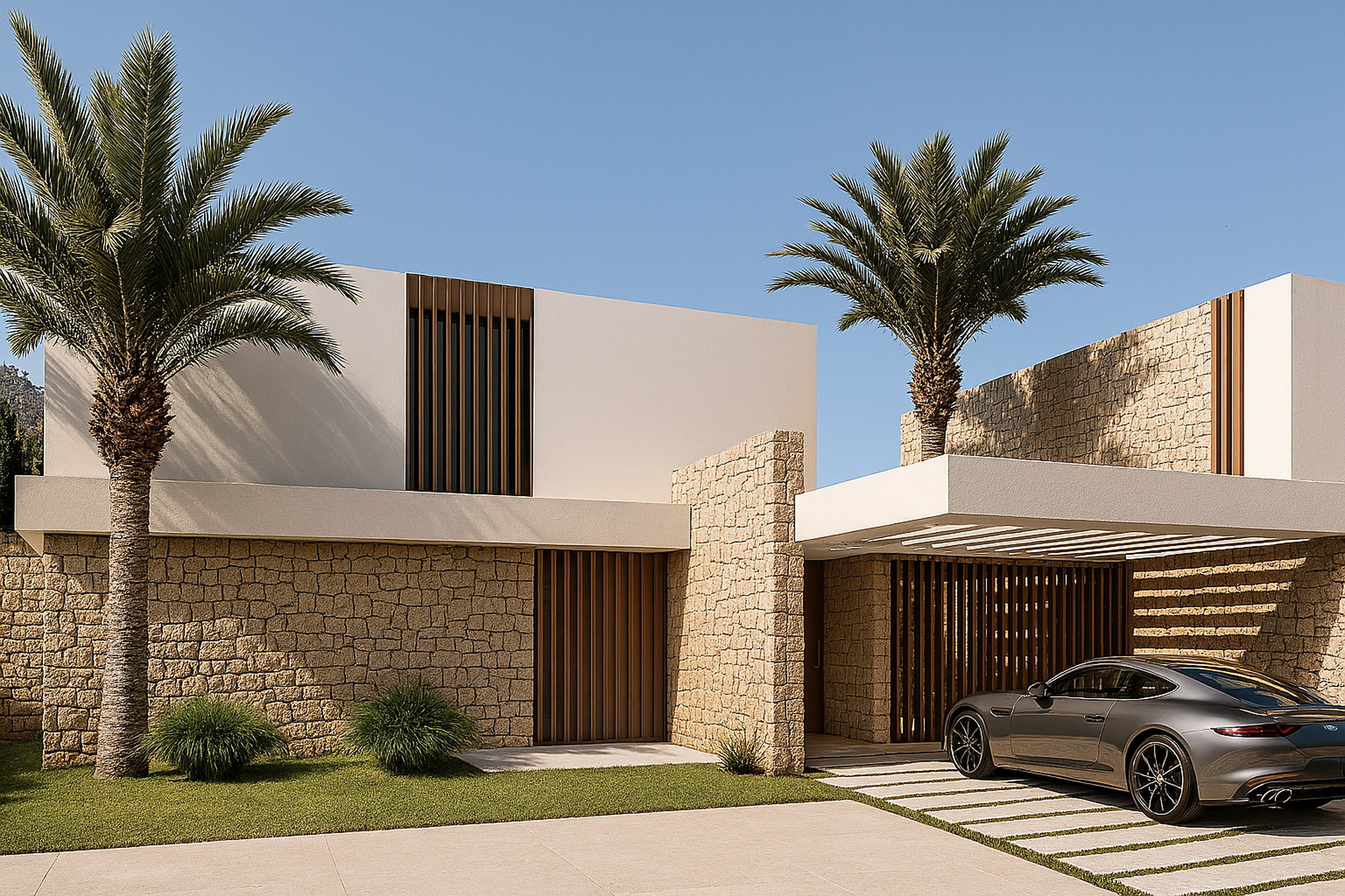 Se trata de dos viviendas unifamiliares adosadas ubicadas en primera línea de campo de golf, concebidas bajo un lenguaje arquitectónico contemporáneo que combina contundencia volumétrica con ligereza visual.