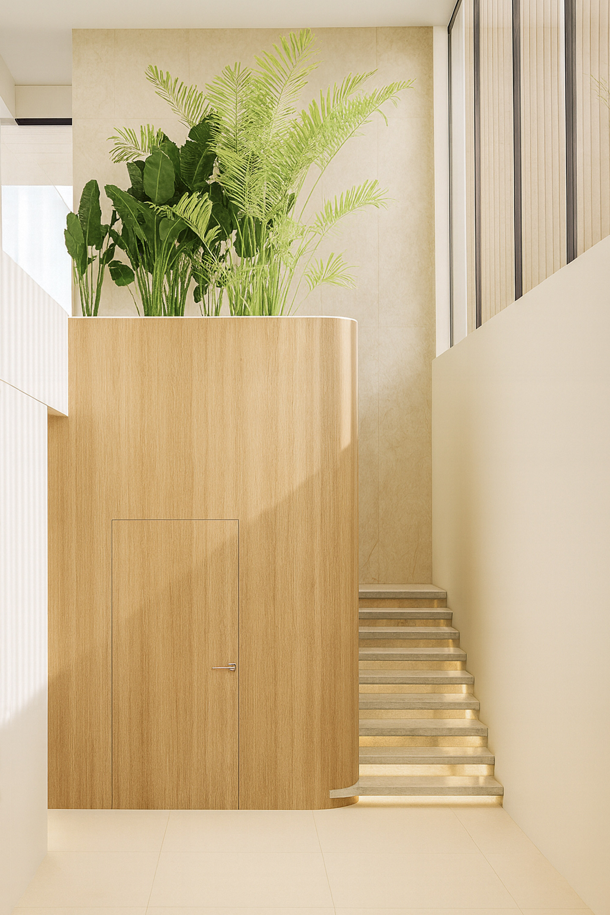 Las fachadas destacan por su transparencia gracias al uso extensivo de grandes ventanales de suelo a techo, que favorecen la entrada de luz natural y establecen una fuerte conexión entre los espacios interiores y el exterior ajardinado. Estos paños acristalados se combinan con elementos de control solar como celosías verticales metálicas en tonos cálidos, que aportan ritmo y contrastan con la solidez de la piedra.
