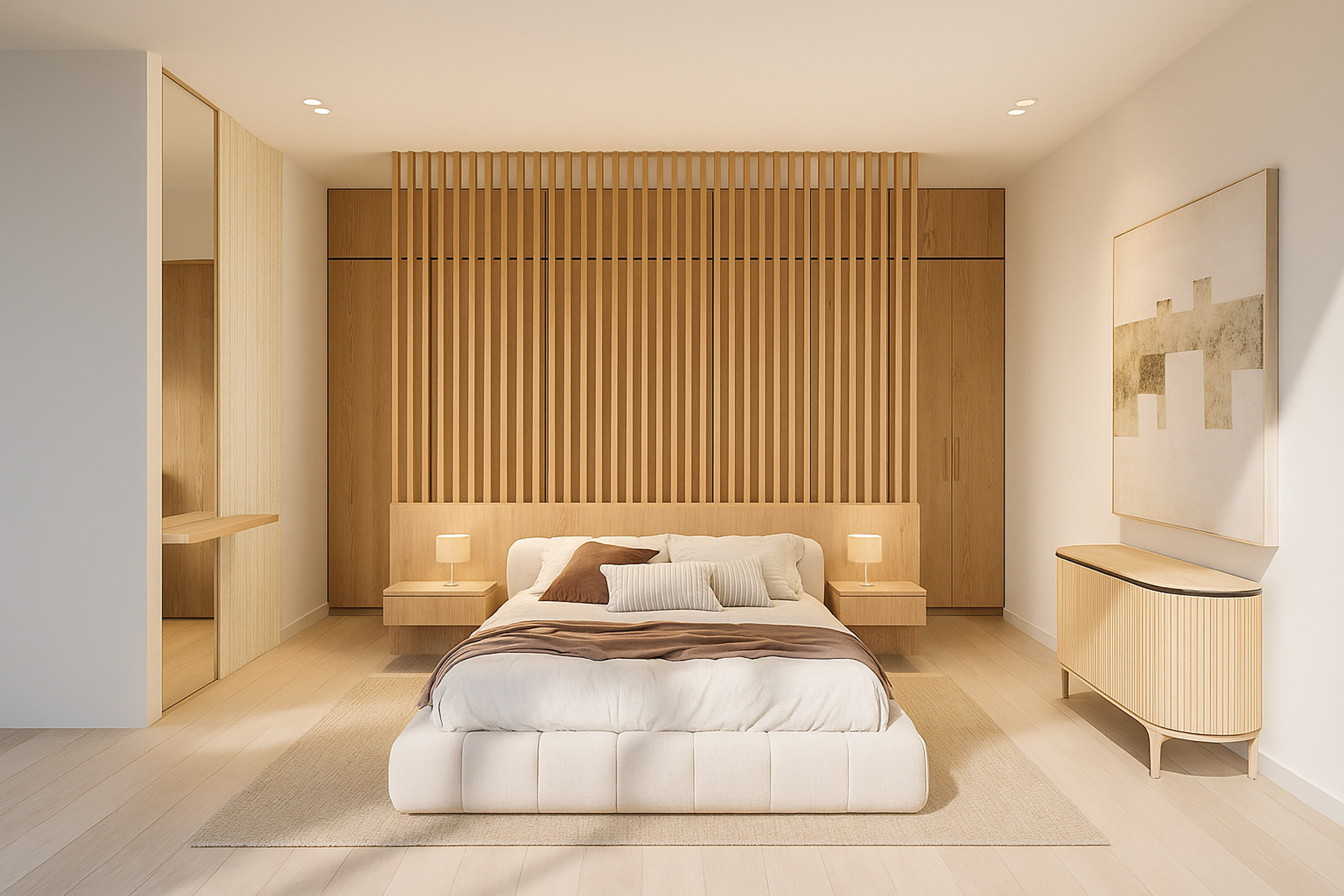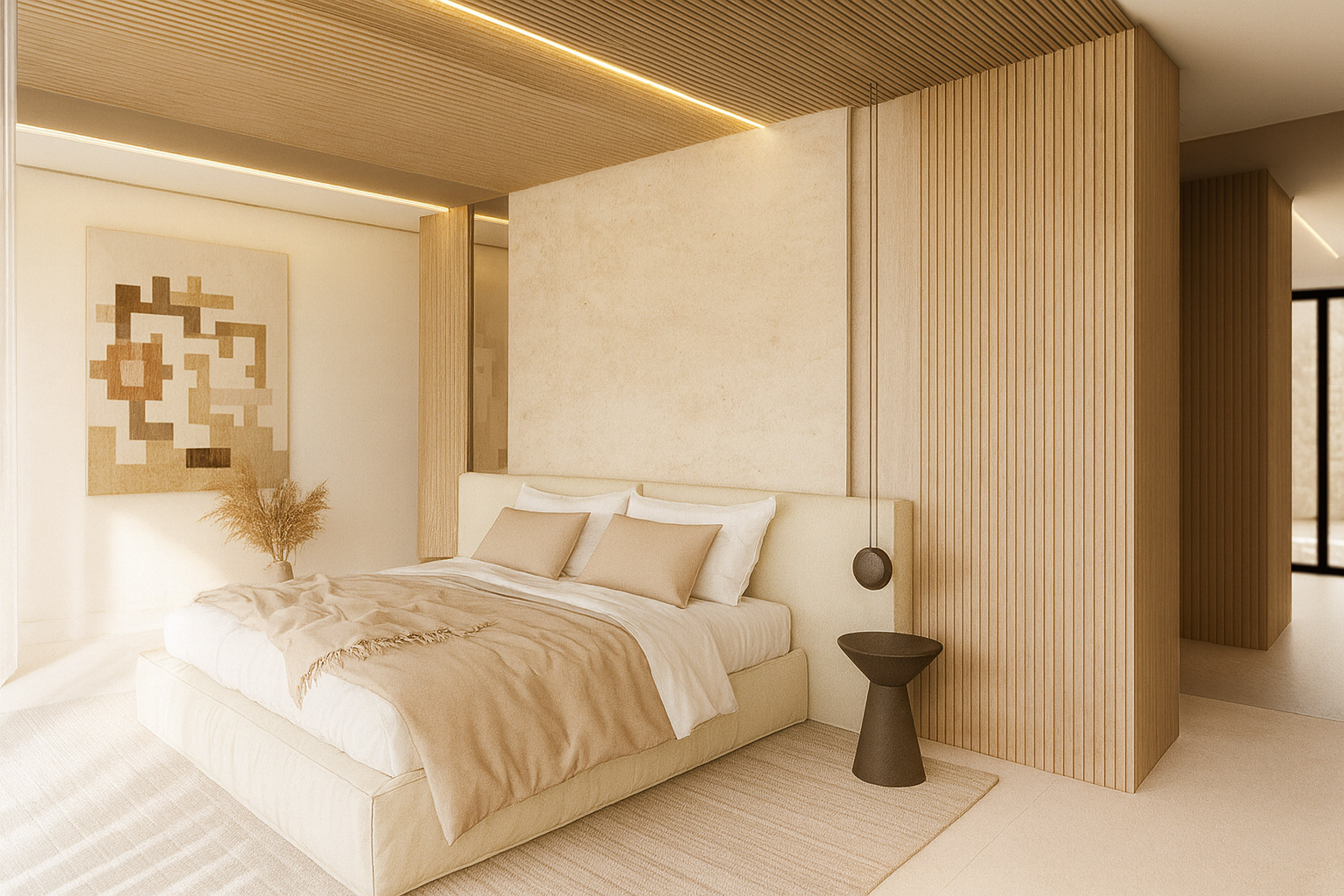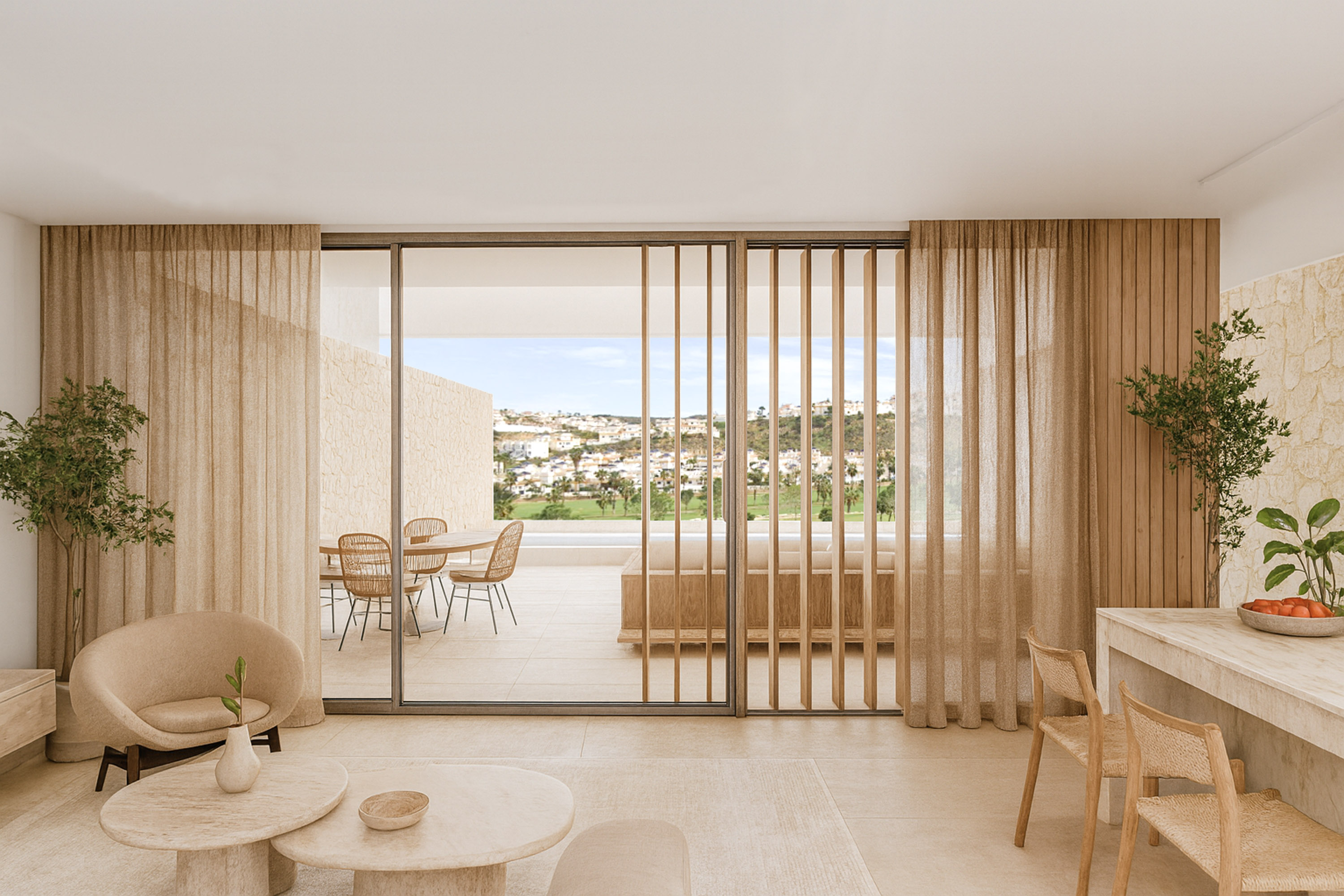 La composición general se caracteriza por un equilibrio entre horizontalidad y verticalidad: la horizontalidad marcada por las líneas de forjados y terrazas, y la verticalidad acentuada por las celosías y los muros de piedra. El resultado es un conjunto sobrio, elegante y atemporal, en el que la arquitectura se funde con el territorio, potenciando tanto las vistas como la experiencia de habitar en un entorno natural privilegiado.
