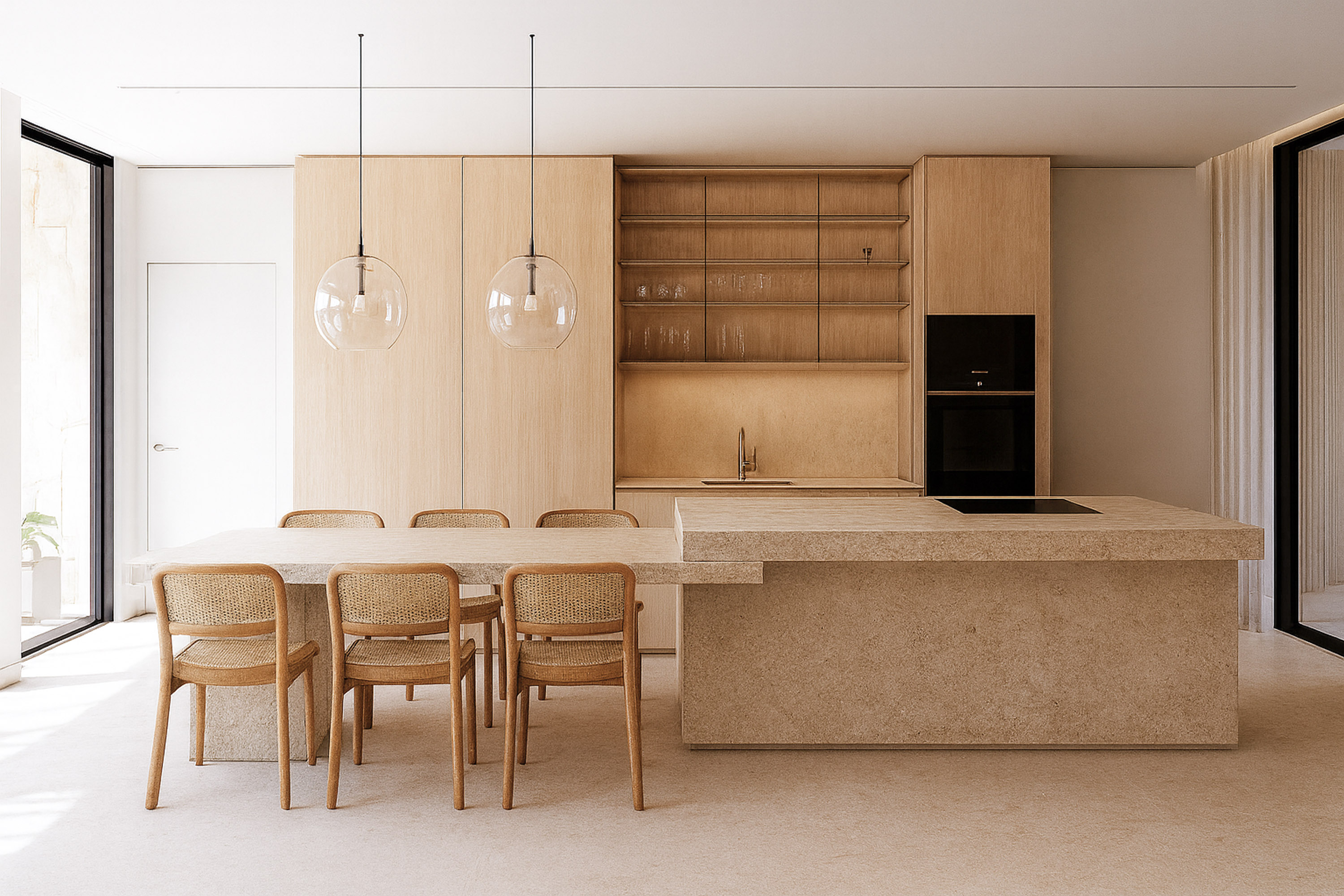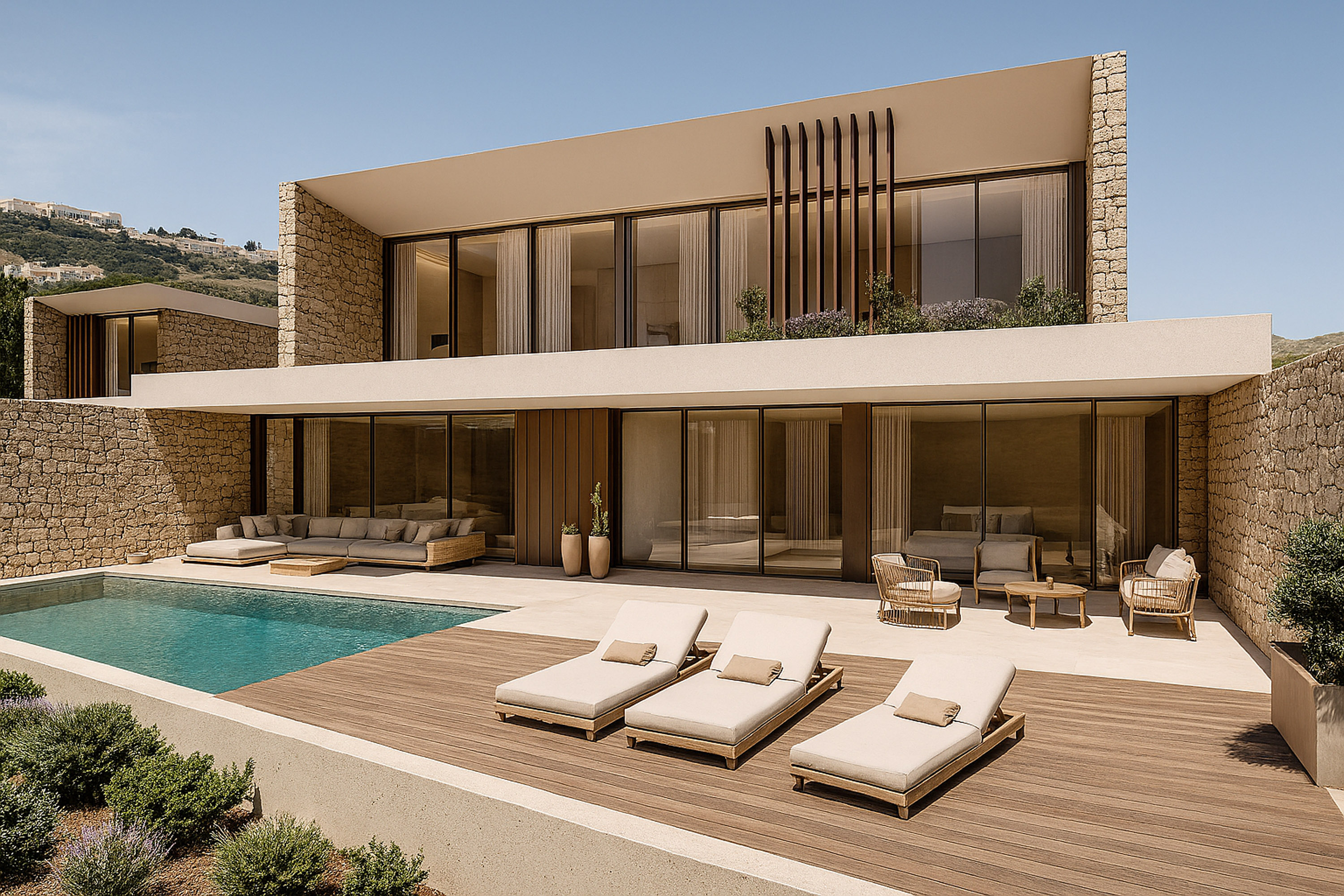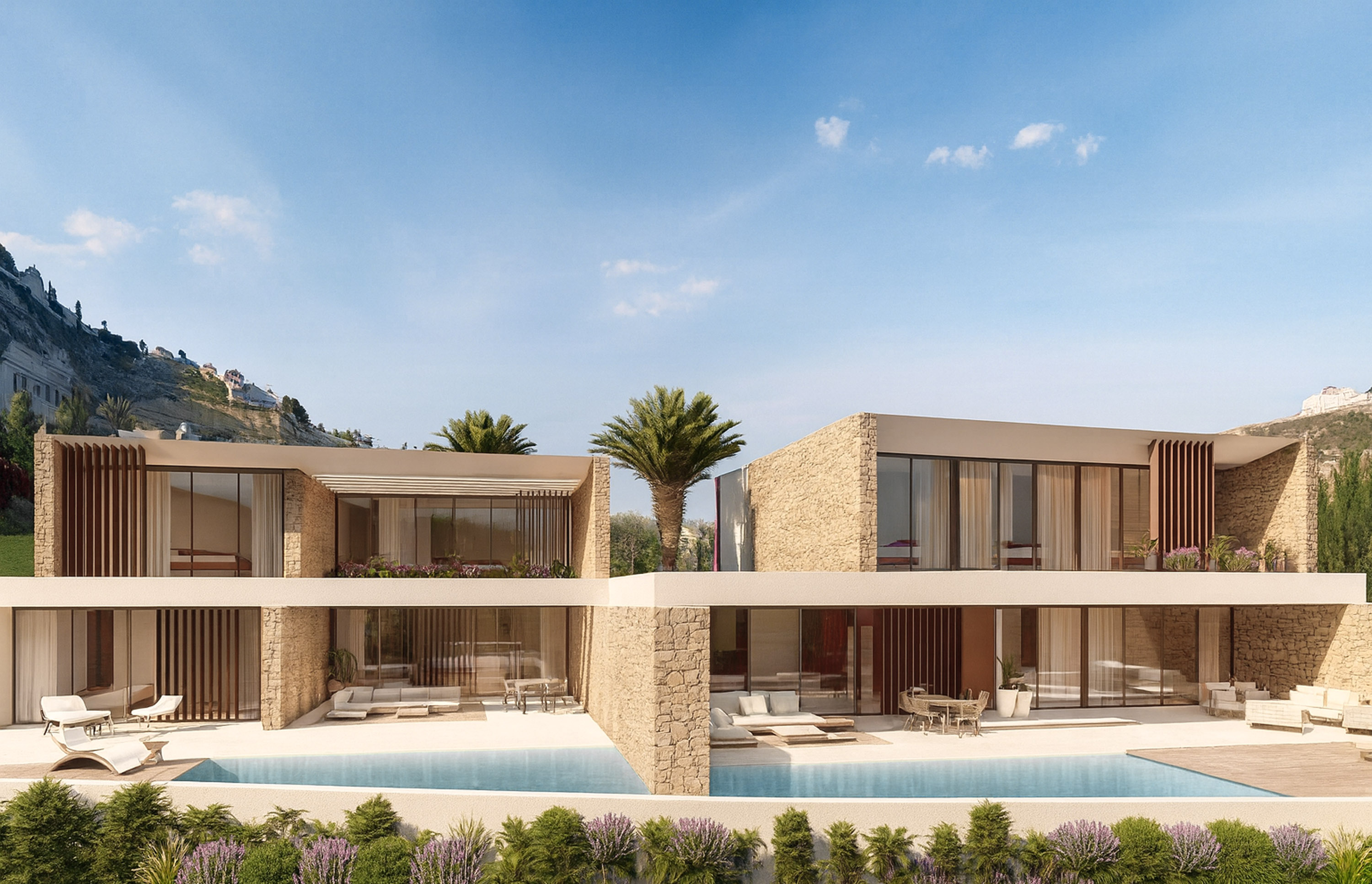 Cada vivienda se organiza en dos niveles principales, con un basamento abierto hacia la piscina y la zona exterior, y un nivel superior que se dispone como un volumen prismático limpio, revestido con mampostería de piedra natural. Este material aporta textura, integración con el paisaje y un carácter mediterráneo que dialoga con el entorno rocoso y vegetal de la ladera.